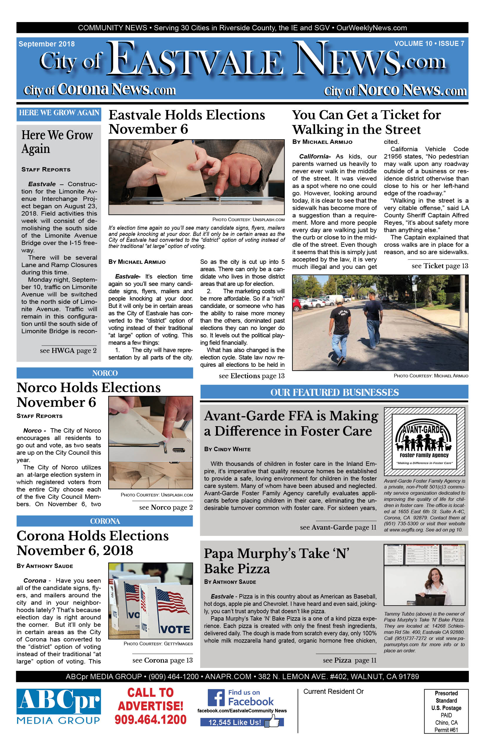 The Eastvale Community News covers local news for Eastvale, Norco, Corona, and Chino. Click the following link to access the complete issue in pdf format: 09-2018.EastvaleNews