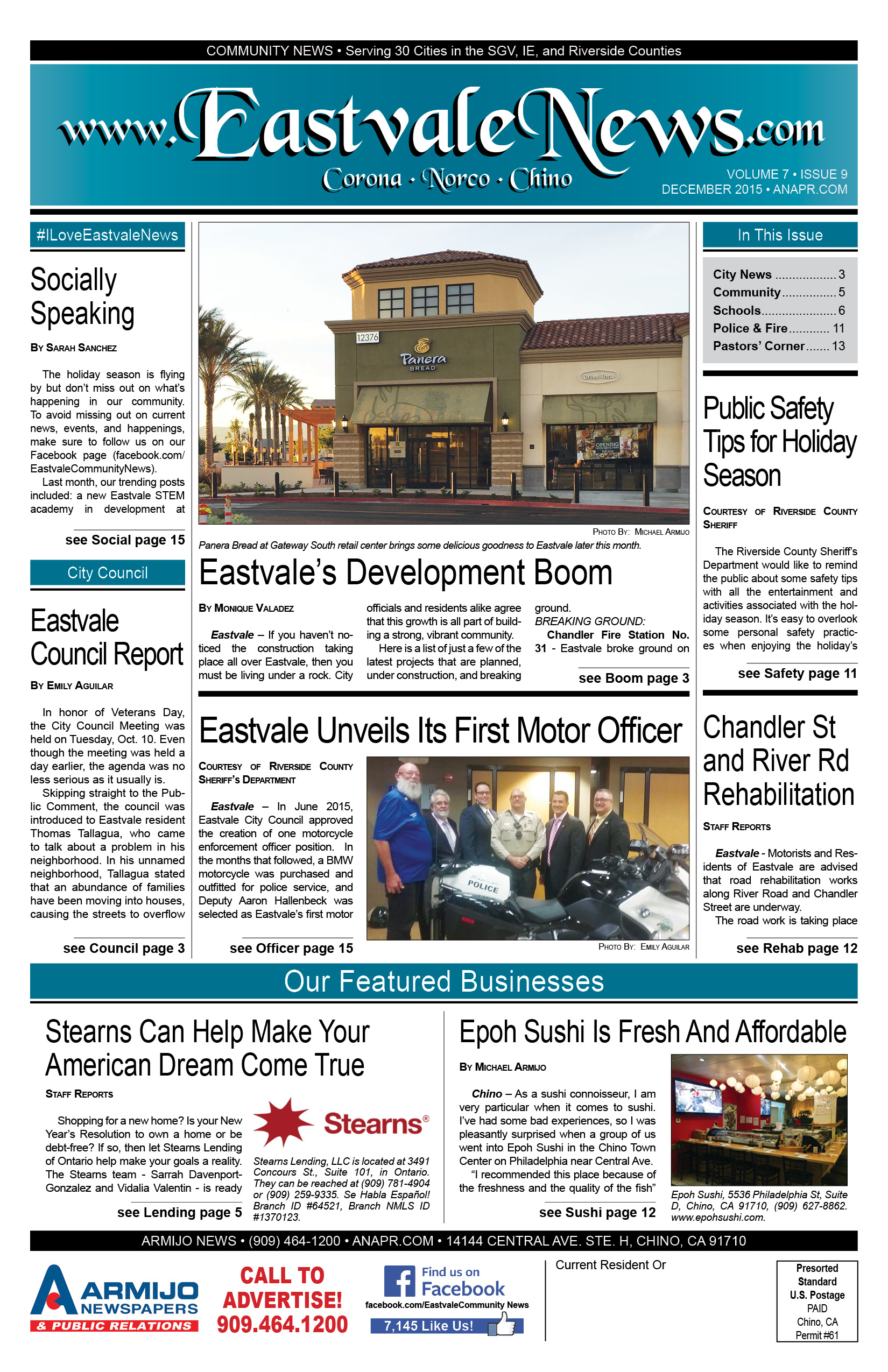 The Eastvale Community News covers local news for Eastvale, Norco, Corona, and Chino. Click the following link to access the complete issue in pdf format: 2015-12-EastvaleNews-WEB