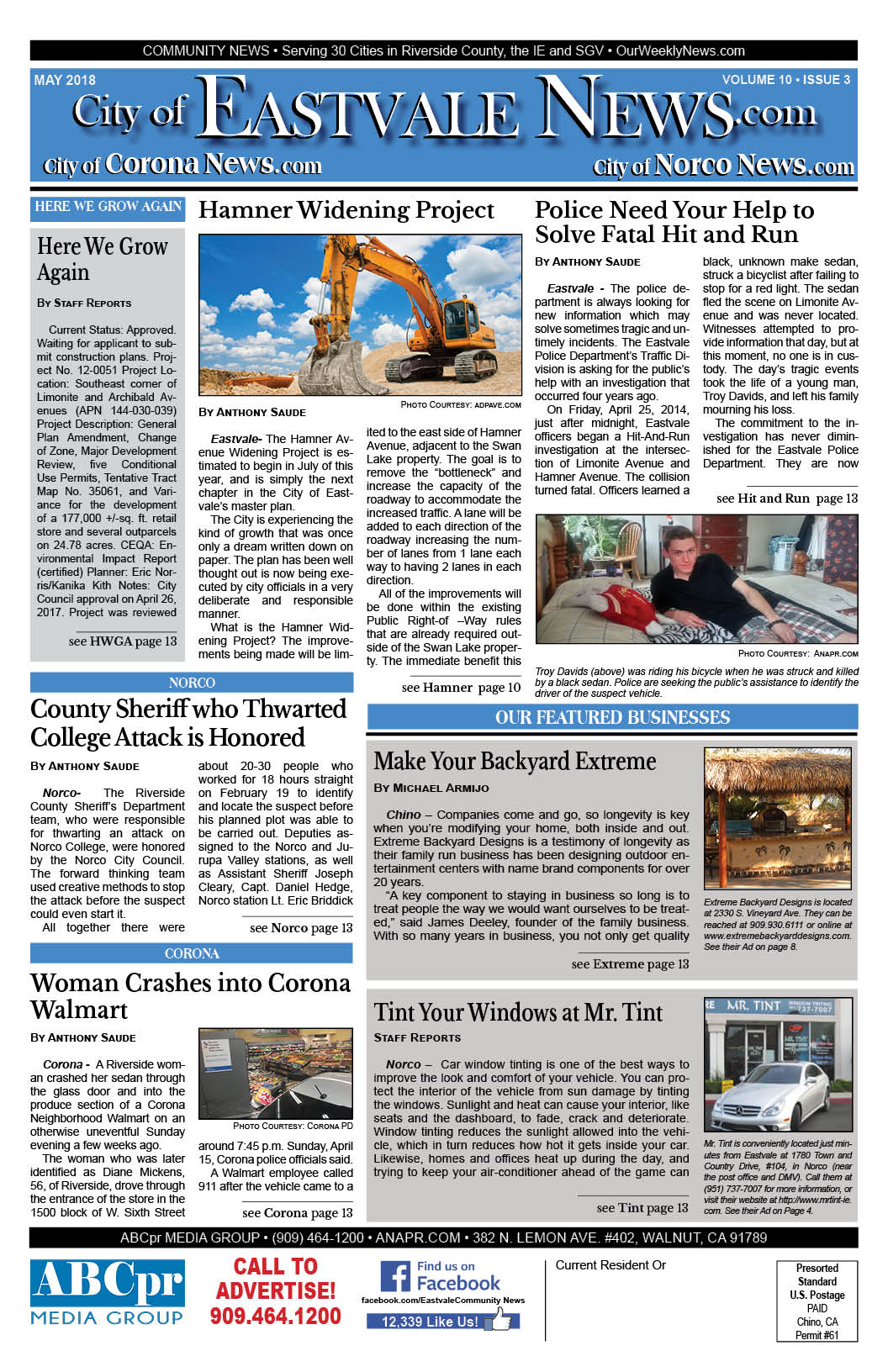 The Eastvale Community News covers local news for Eastvale, Norco, Corona, and Chino. Click the following link to access the complete issue in pdf format: EastvaleNews.05-2018