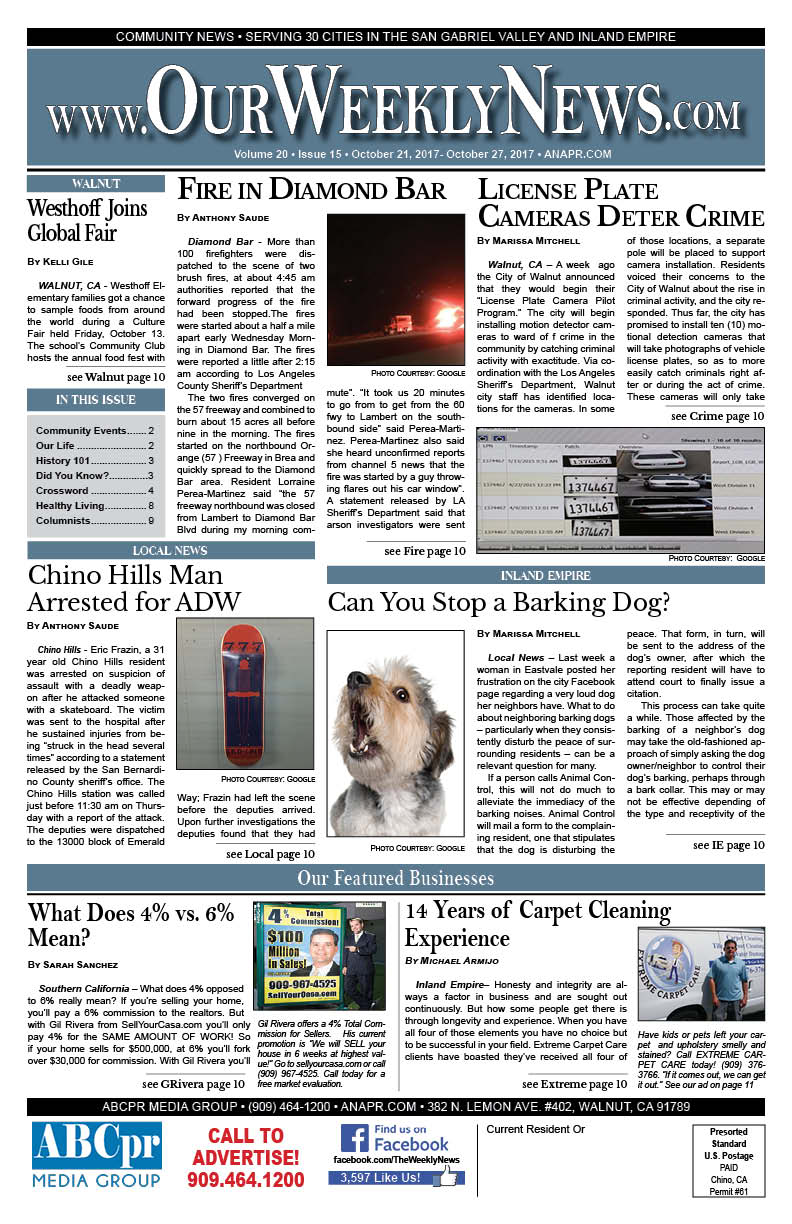 The Weekly News covers community news for Chino, Chino Hills, Diamond Bar, Walnut, Rowland Heights and surrounding areas of San Gabriel Valley and the Inland Empire.Click this link to access the complete issue in PDF format: Weekly10.21.2017