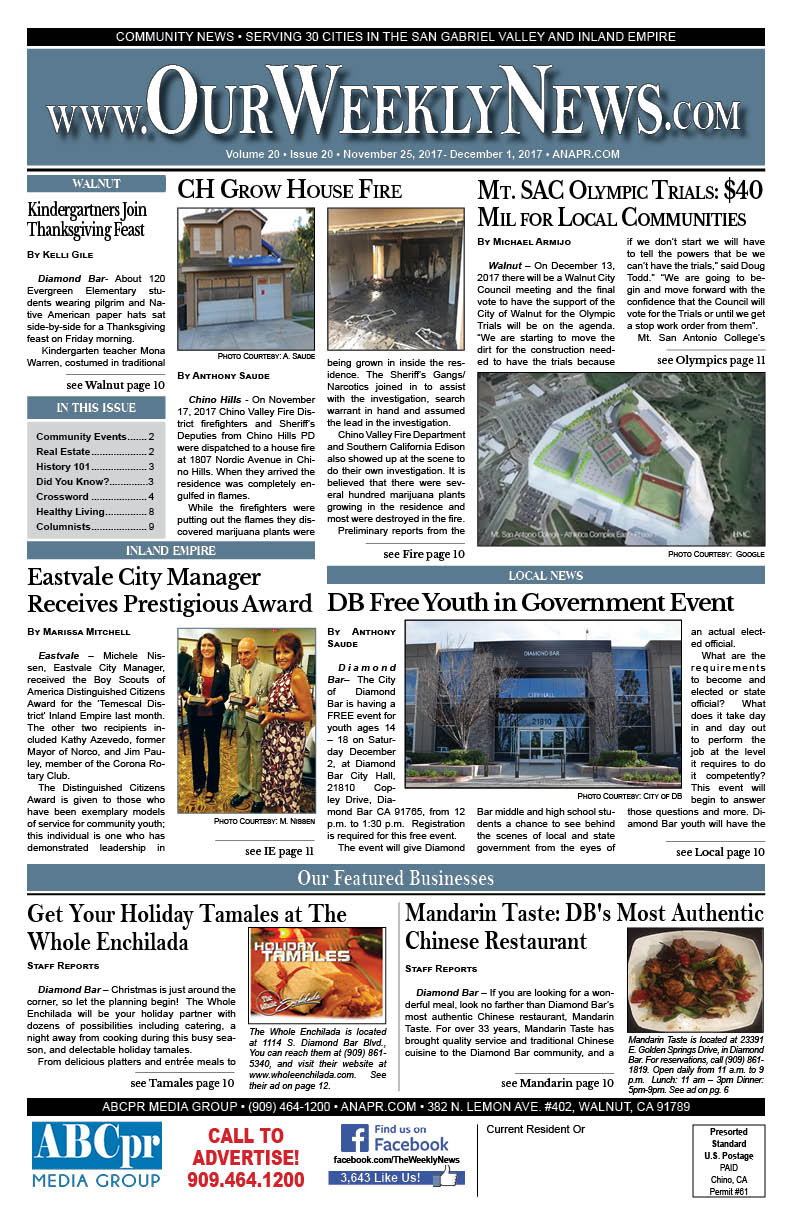 The Weekly News covers community news for Chino, Chino Hills, Diamond Bar, Walnut, Rowland Heights and surrounding areas of San Gabriel Valley and the Inland Empire.Click this link to access the complete issue in PDF format: ALL.Weekly11.18.2017