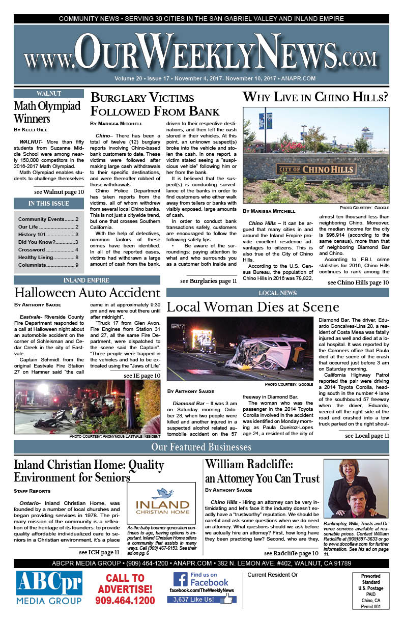 The Weekly News covers community news for Chino, Chino Hills, Diamond Bar, Walnut, Rowland Heights and surrounding areas of San Gabriel Valley and the Inland Empire.Click this link to access the complete issue in PDF format: WebWeekly10.28.2017
