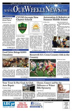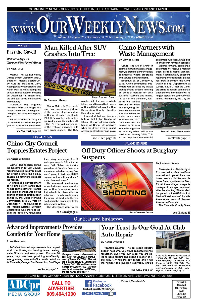 The Weekly News covers community news for Chino, Chino Hills, Diamond Bar, Walnut, Rowland Heights and surrounding areas of San Gabriel Valley and the Inland Empire.Click this link to access the complete issue in PDF format:Weekly12.23.2017
