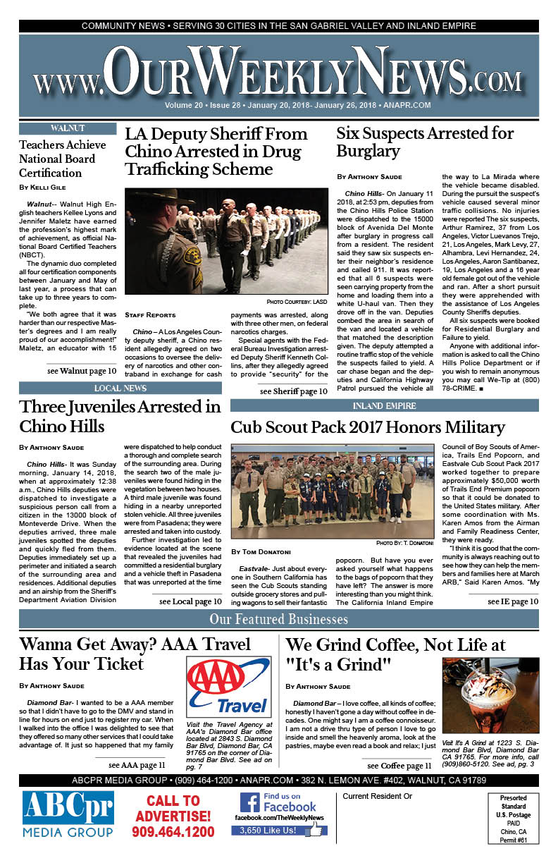 The Weekly News covers community news for Chino, Chino Hills, Diamond Bar, Walnut, Rowland Heights and surrounding areas of San Gabriel Valley and the Inland Empire.Click this link to access the complete issue in PDF format: Weekly01.20.2018