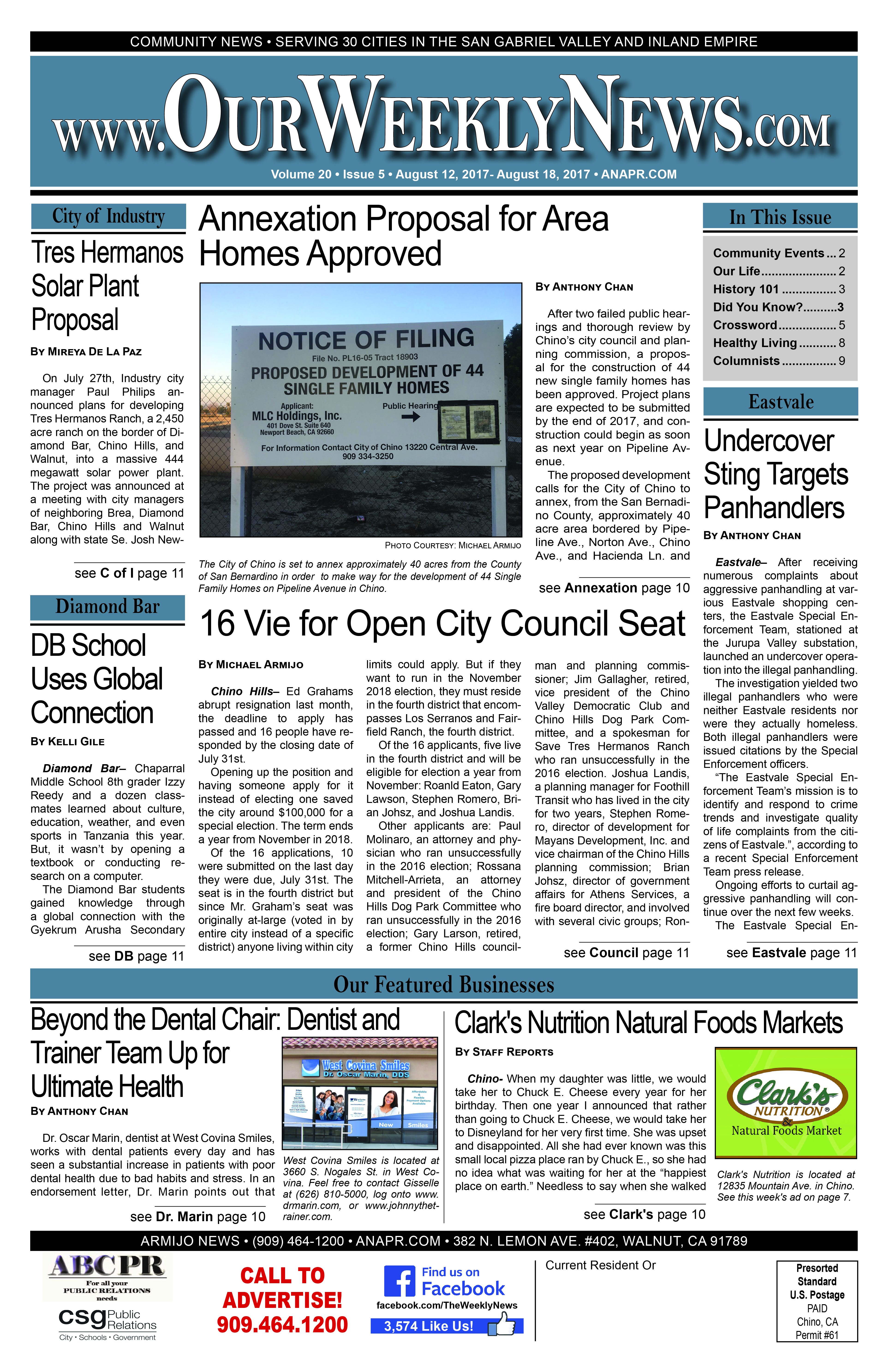 The Weekly News covers community news for Chino, Chino Hills, Diamond Bar, Walnut, Rowland Heights and surrounding areas of San Gabriel Valley and the Inland Empire.Click this link to access the complete issue in PDF format: 8-12-17.Weekly (1)