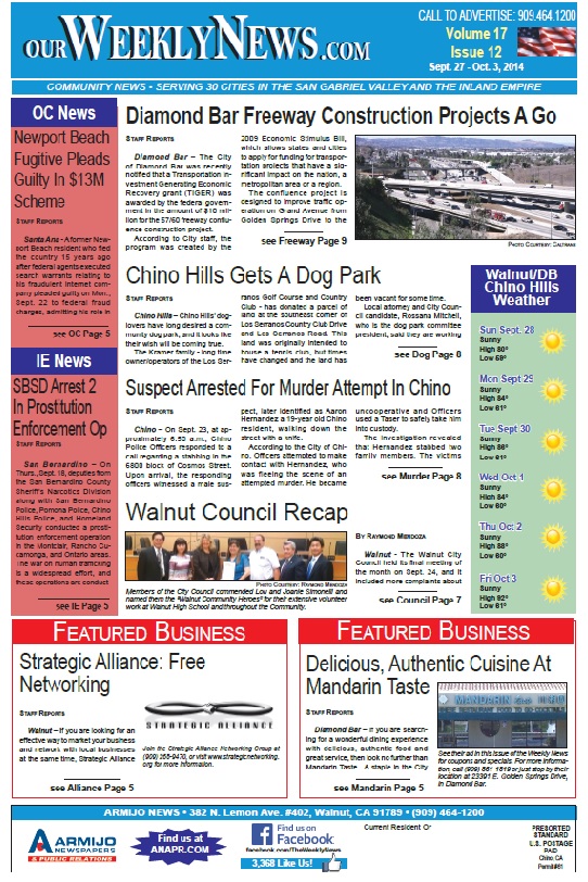 The Weekly News covers community news for Diamond Bar, Walnut, Chino Hills, Rowland Heights and surrounding areas of San Gabriel Valley and the Inland Empire. Click this link Sept27WeeklyAll to access the complete Sept 27th, 2014 issue in pdf format.