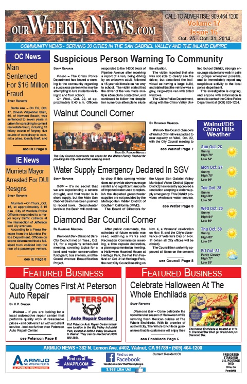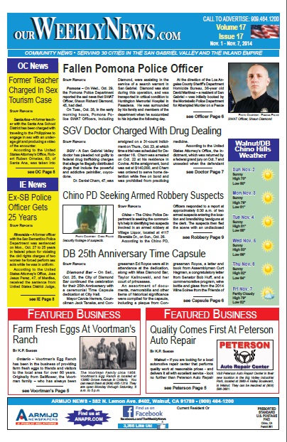 The Weekly News covers community news for Diamond Bar, Walnut, Chino Hills, Rowland Heights and surrounding areas of San Gabriel Valley and the Inland Empire. Click this link Oct25WeeklyAll to access the complete Oct. 25th, 2014 issue in pdf format.